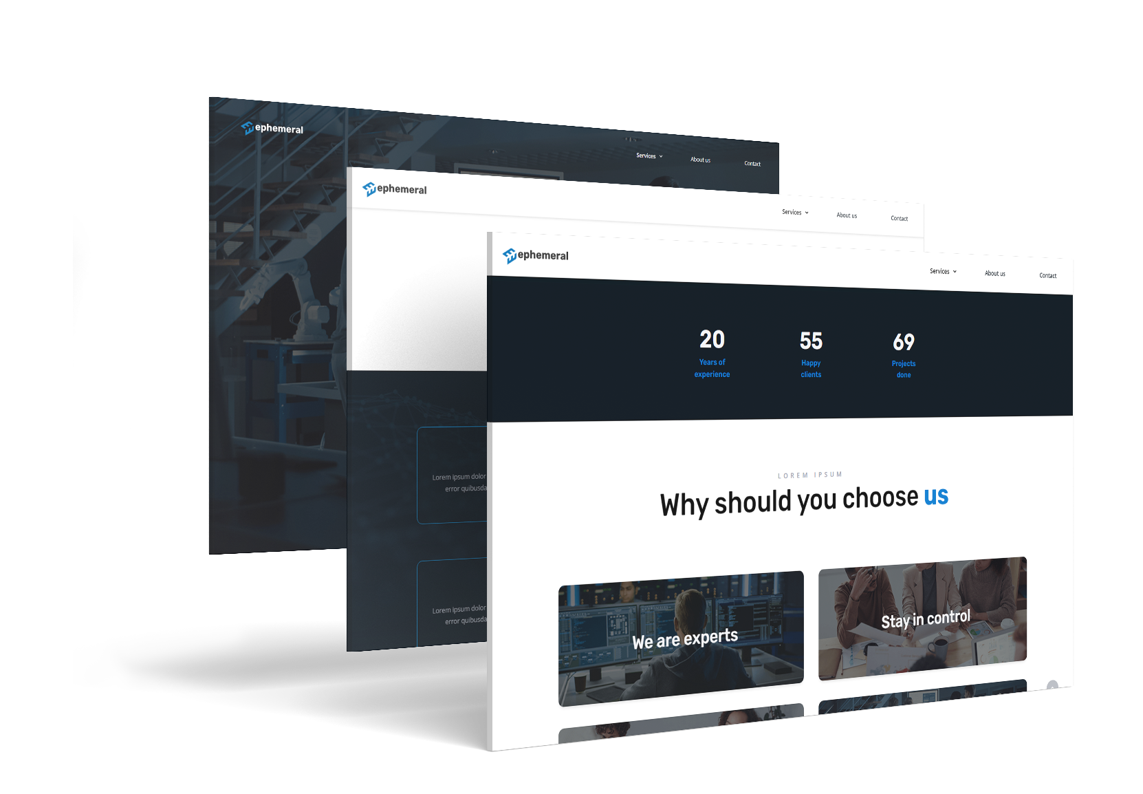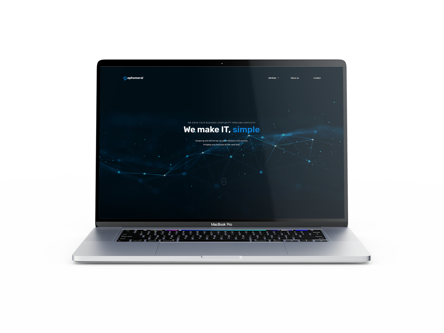 Diseño de la web corporativa de Ephemeral Software. Diseño de las interfaces, del viaje del usuario y diseño UX/UI. Maquetación usando HTML, CSS, Javascript y Tailwind CSS. Además de la búsqueda y selección de las imágenes en stocks gratuitos y de pago, la edición de estas y la redacción de varios copies.